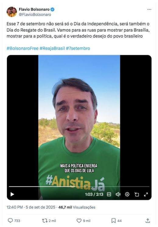 O senador Flávio Bolsonaro (PL-RJ) afirmou que este 7 de setembro será lembrado como o “Dia do Resgate do Brasil”. A declaração foi feita nesta sexta-feira (5), em suas redes sociais, onde destacou a importância das manifestações marcadas para o próximo domingo (7).