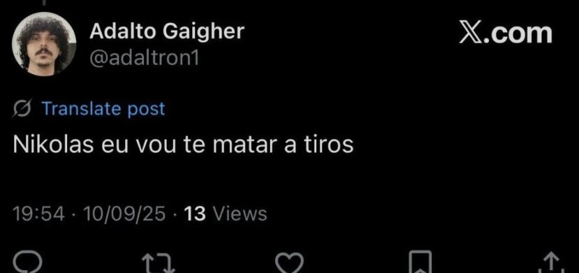Na publicação, Gaigher escreveu: “Nikolas, eu vou te matar a tiros”. A declaração criminosa aconteceu justamente no mesmo dia em que o comentarista conservador Charlie Kirk, aliado do presidente Donald Trump, foi covardemente assassinado durante um debate em uma universidade no estado de Utah, nos Estados Unidos.