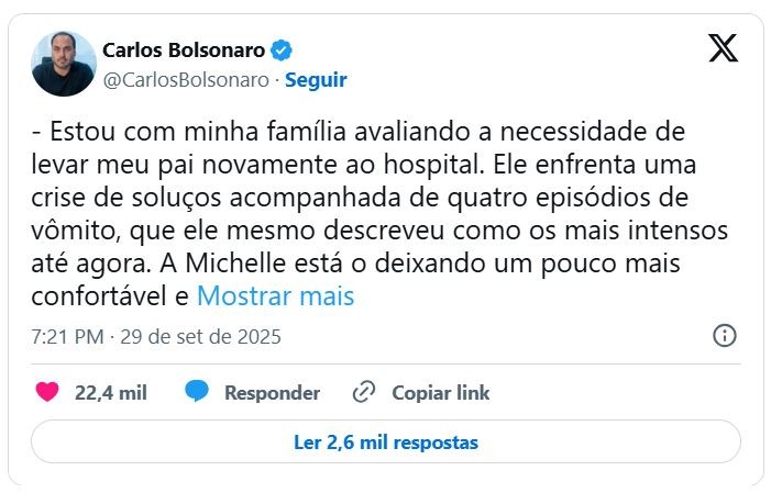 Esse tipo de crise não é novo para Bolsonaro. Em 17 de setembro, médicos identificaram duas lesões compatíveis com câncer de pele, o que aumentou a vigilância sobre sua saúde. Um dia antes, em 16 de setembro, ele precisou ser internado no Hospital DF Star, em Brasília, após sofrer queda de pressão, vômitos e soluços constantes.