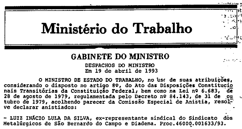 A aposentadoria de Lula, conforme apurado pelo Pleno.News com base em dados de um procedimento do Ministério Público Federal (MPF), é decorrente de uma decisão da Comissão Especial de Anistia, que foi acolhida pelo então ministro do Trabalho Walter Barelli em despacho assinado no dia 19 de abril de 1993 e publicado no Diário Oficial da União (DOU) no dia seguinte, declarando o petista um anistiado.