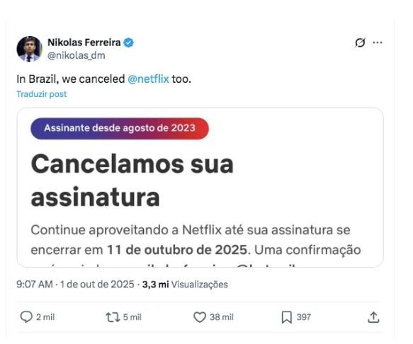 – “Aqui no Brasil, nós também cancelamos a Netflix” – escreveu Nikolas, reforçando o movimento. O motivo é claro: a plataforma de streaming tem insistido em disseminar produções com forte viés ideológico e direcionadas às crianças.