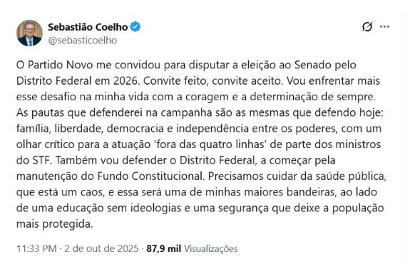 O ex-desembargador Sebastião Coelho confirmou nesta quinta-feira (2) que será candidato ao Senado pelo Distrito Federal nas eleições de 2026. A disputa será pelo Partido Novo, legenda que vem se destacando por levantar bandeiras de renovação política.