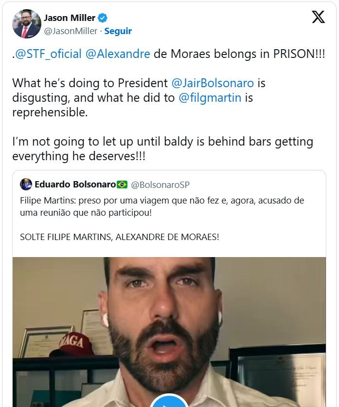 O post foi replicado pelo deputado Eduardo Bolsonaro, que mantém interlocução com Miller nos EUA, além de outros integrantes do governo americano.