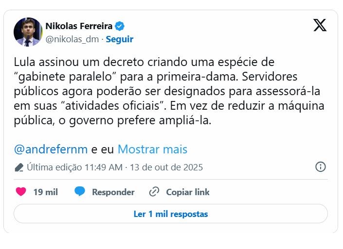 – O decreto de Lula cria uma estrutura oficial e cargos públicos para servir à primeira-dama Janja Lula da Silva, dentro do Gabinete Pessoal da Presidência da República, algo inédito na história republicana. A medida, assinada também pelos ministros Rui Costa (Casa Civil) e Esther Dweck (Gestão), confere à esposa do presidente um aparato público e funções institucionais sem qualquer amparo legal – argumentou, segundo informações publicadas pela revista Veja. Na avaliação do congressista, o decreto fere os princípios de legalidade, moralidade e impessoalidade previstos na Constituição. Também extrapola o poder regulamentar do Executivo.