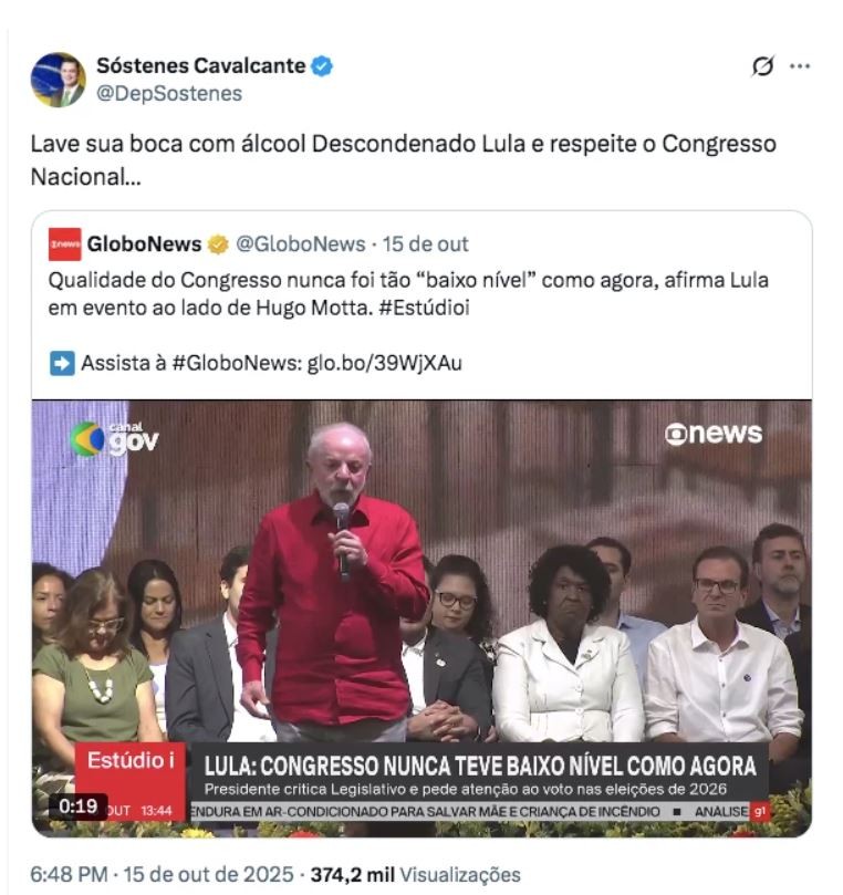 Sóstenes Cavalcante rebate Lula: “Lave sua boca com álcool”