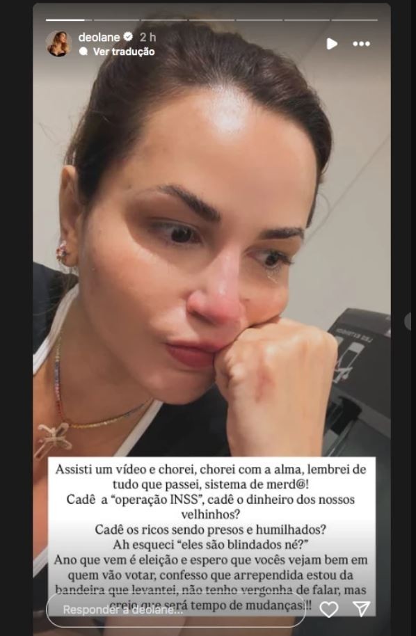 Sem citar diretamente o nome do petista, Deolane afirmou que se arrepende da “bandeira que levantou” nas últimas eleições. A advogada também cobrou explicações sobre o escândalo de corrupção envolvendo o Instituto Nacional do Seguro Social (INSS), questionando com indignação: