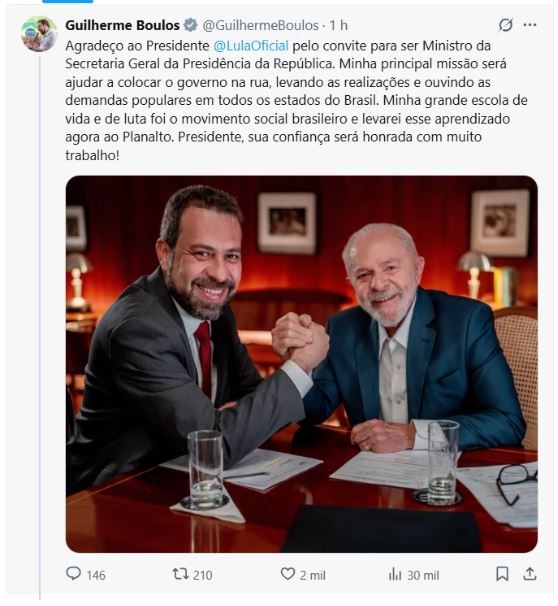 Boulos também destacou que sua experiência em movimentos sociais será o alicerce de sua atuação no Planalto. “Minha grande escola de vida e de luta foi o movimento social brasileiro e levarei esse aprendizado agora ao Planalto. Presidente, sua confiança será honrada com muito trabalho”, escreveu.