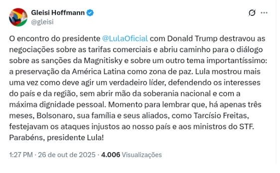 “O encontro do presidente Lula com Donald Trump destravou as negociações sobre as tarifas comerciais e abriu caminho para o diálogo sobre as sanções da Magnitisky e sobre um outro tema importantíssimo: a preservação da América Latina como zona de paz”, escreveu Gleisi.