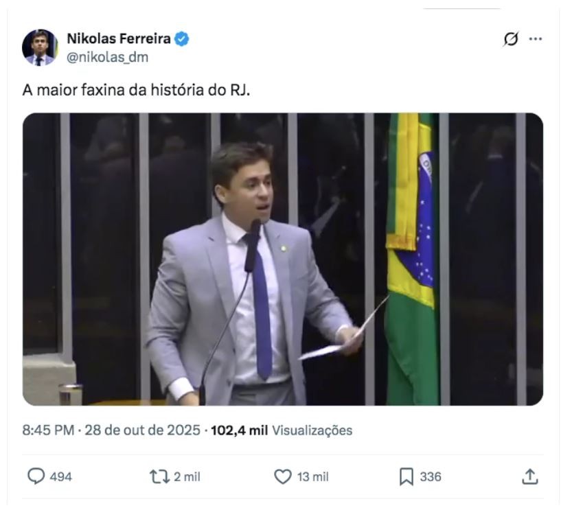 Nesta terça-feira (28), o deputado federal Nikolas Ferreira comentou a grande operação policial realizada nos complexos do Alemão e da Penha, na Zona Norte do Rio de Janeiro, classificando a ação como “a maior faxina da história do estado”.