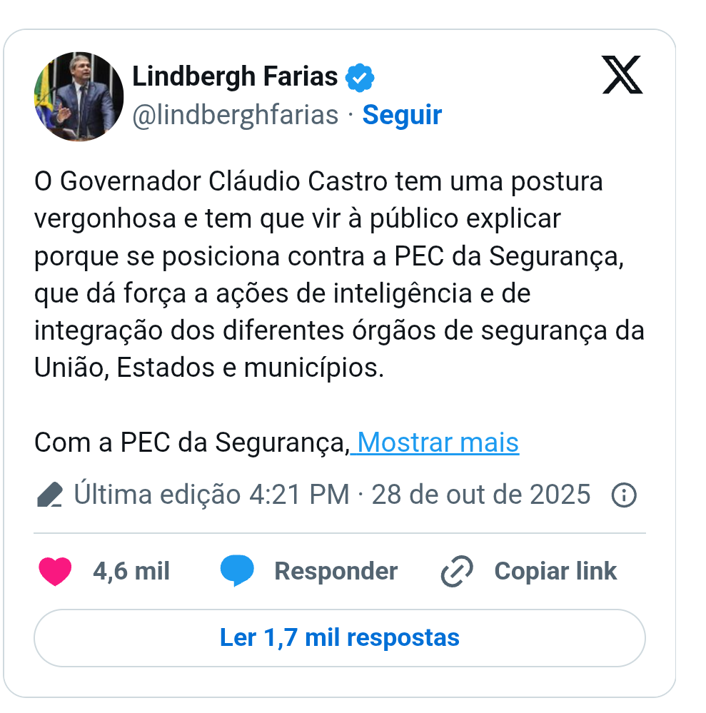 – Não descarto que a operação de hoje no Rio de Janeiro tenha sido deflagrada com a intenção abjeta de tentar mudar a pauta da política nacional. O próprio Cláudio Castro declarou em 2022 em entrevista ao jornalista Octávio Guedes sobre o uso eleitoral de operações como essa: “se me baseasse em pesquisa, faria uma operação policial por semana”. A hipótese é cruel, mas plausível: as maiores chacinas da história do Rio aconteceram sob sua gestão: Jacarezinho, Vila Cruzeiro, Alemão e agora Penha – explicou.