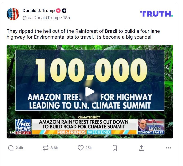 O presidente dos Estados Unidos, Donald Trump, voltou a chamar atenção neste domingo (9) ao criticar duramente a construção de uma rodovia de quatro faixas em Belém (PA) — cidade que será sede da COP30. Em publicação na Truth Social, Trump classificou o projeto como um “grande escândalo”, compartilhando um vídeo do programa da Fox News em que o editor do portal ClimateDepot, Marc Morano, e o comentarista Charles Hurt debatem a obra.