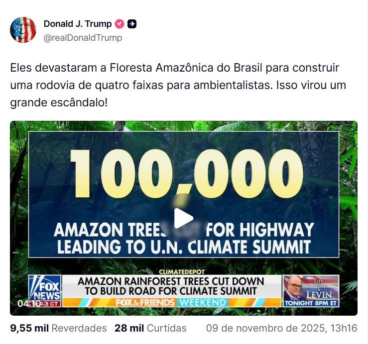 A postagem veio acompanhada de um vídeo da Fox News, emissora conservadora americana, que enviou correspondentes a Belém (PA) para cobrir a COP30.