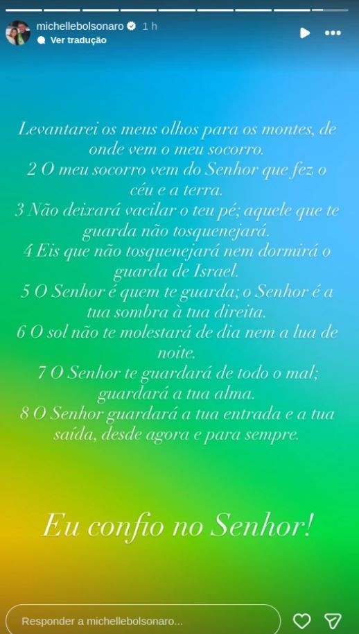 – Levantarei os meus olhos para os montes, de onde vem o meu socorro. O meu socorro vem do Senhor que fez o céu e a terra – diz o Salmo 121, compartilhado no story da ex-primeira-dama.– Eu confio no Senhor! – escreveu Michelle em seguida. Neste sábado (22), o ministro do Supremo Tribunal Federal (STF) Alexandre de Moraes expediu ordem de prisão preventiva de Jair Bolsonaro (PL). O pedido foi feito pela Polícia Federal (PF). A decisão ainda não marca o início do cumprimento da pena de reclusão.