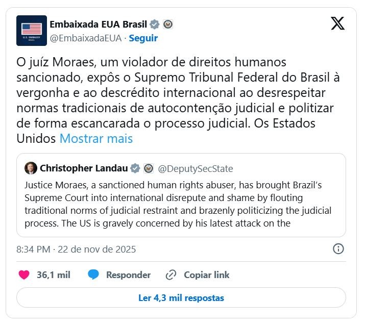 Em outro trecho, a embaixada alertou para os riscos institucionais: “não há nada mais perigoso para a democracia do que um juiz que não reconhece limites para seu poder”. A publicação praticamente replicou, em português, críticas já feitas horas antes pelo subsecretário de Estado dos EUA, Christopher Landau, dando peso diplomático à posição oficial do governo norte-americano.