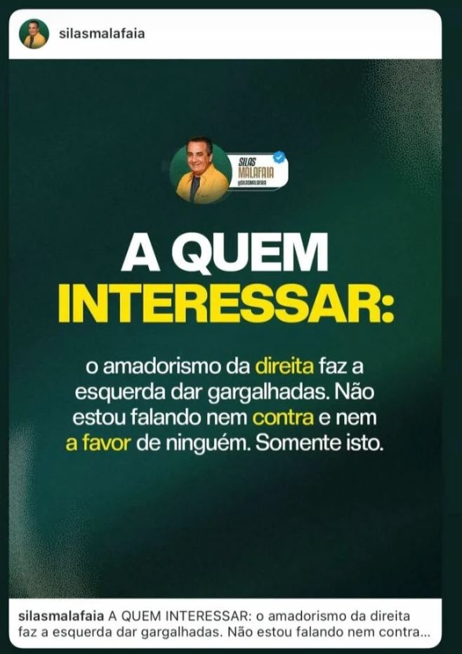 Por meio das redes, Malafaia disse que “o amadorismo da direita faz a esquerda dar gargalhadas”. – A QUEM INTERESSAR: o amadorismo da direita faz a esquerda dar gargalhadas. Não estou falando nem contra e nem a favor de ninguém. Somente isto – escreveu.