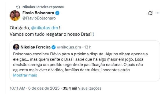 "Bolsonaro escolheu Flávio para a próxima disputa. Alguns olham apenas a eleição. Mas quem sente o Brasil sabe que há algo maior em jogo. Essa decisão carrega um pedido urgente de pacificação nacional. O país não aguenta mais viver dividido, famílias destruídas, inocentes atrás de grades, enquanto a política vira palco de perseguição." — escreveu o deputado.