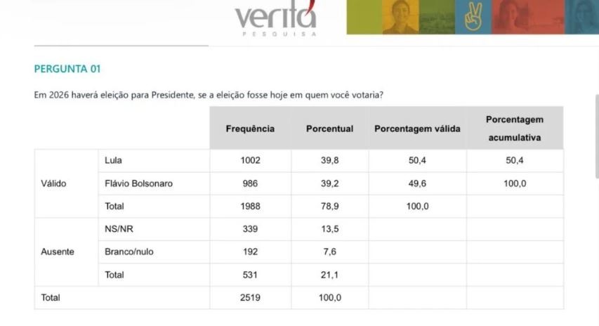 De acordo com o levantamento, que ouviu 2.519 eleitores em todo o país, Flávio surge praticamente empatado com o presidente Lula. Nos votos totais, Lula marca 39,8%, enquanto Flávio aparece com 39,2%, diferença mínima dentro da margem de erro de dois pontos percentuais. Nos votos válidos, o embate fica ainda mais apertado: "Lula com 50,4% contra 49,6% de Flávio Bolsonaro".