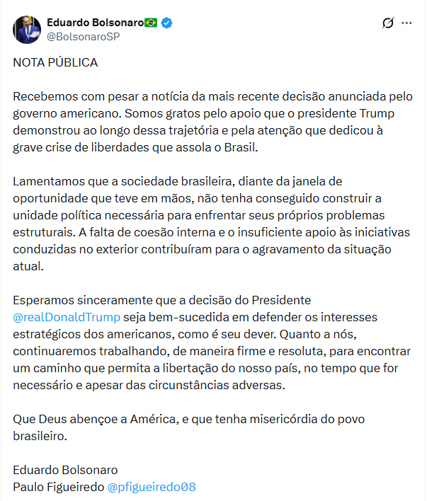 “Recebemos com pesar a notícia da mais recente decisão anunciada pelo governo americano. Somos gratos pelo apoio que o presidente Trump demonstrou ao longo dessa trajetória e pela atenção que dedicou à grave crise de liberdades que assola o Brasil”
